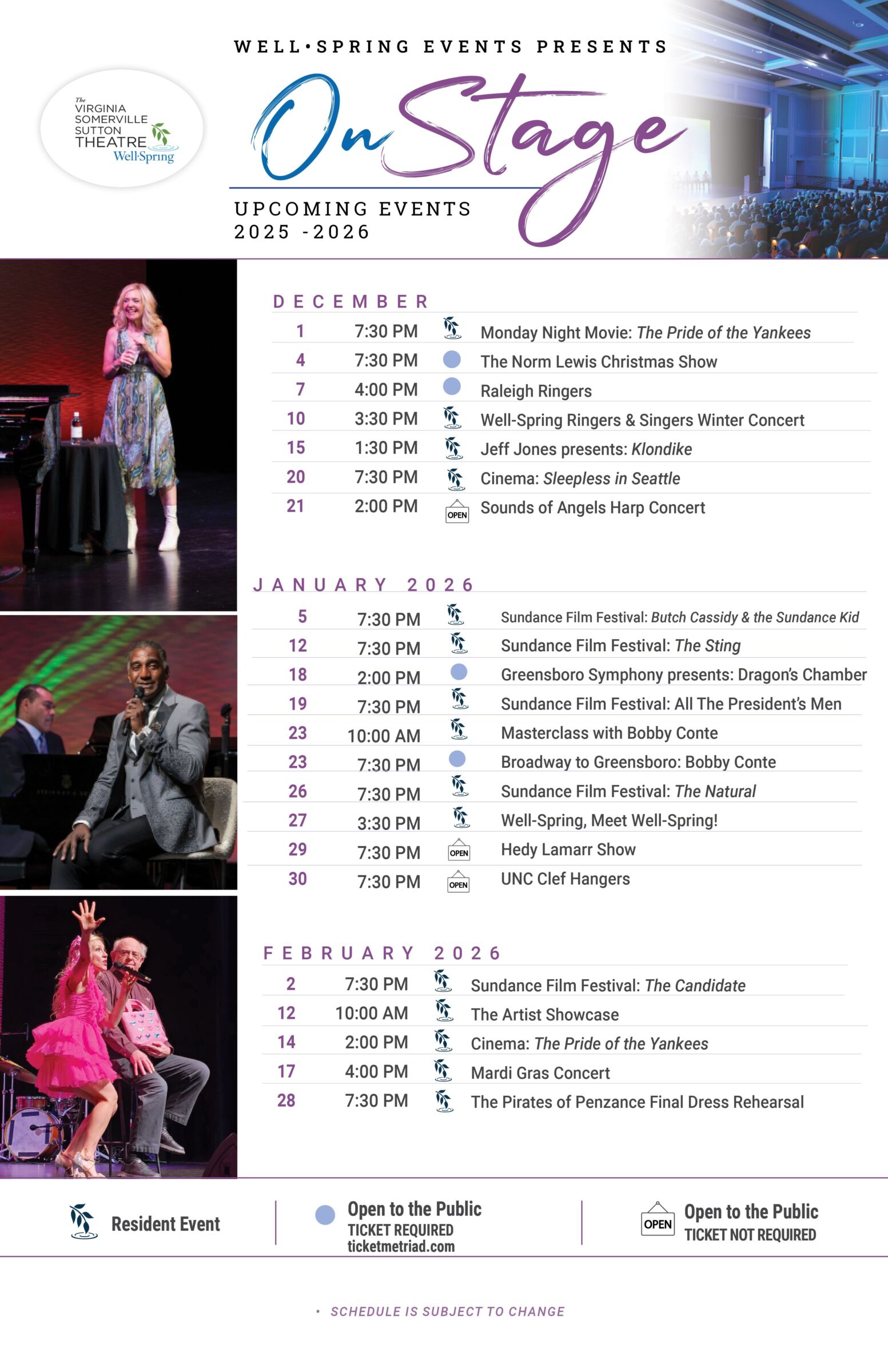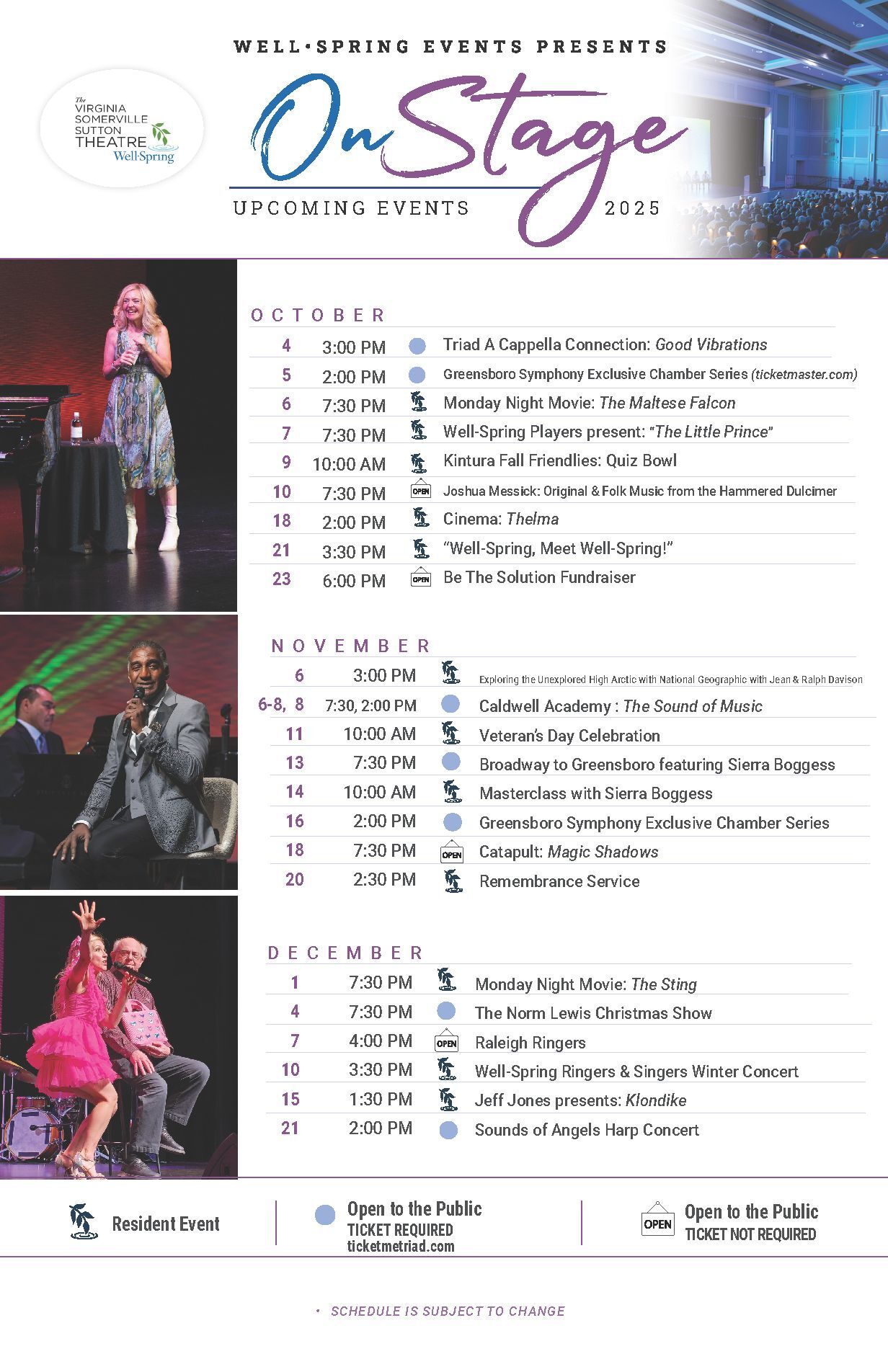 Events that are open to the public are noted. Tickets for public events may be purchased via ticketmetriad.com or by visiting the website associated with the event, noted in the key at the bottom of the calendar.